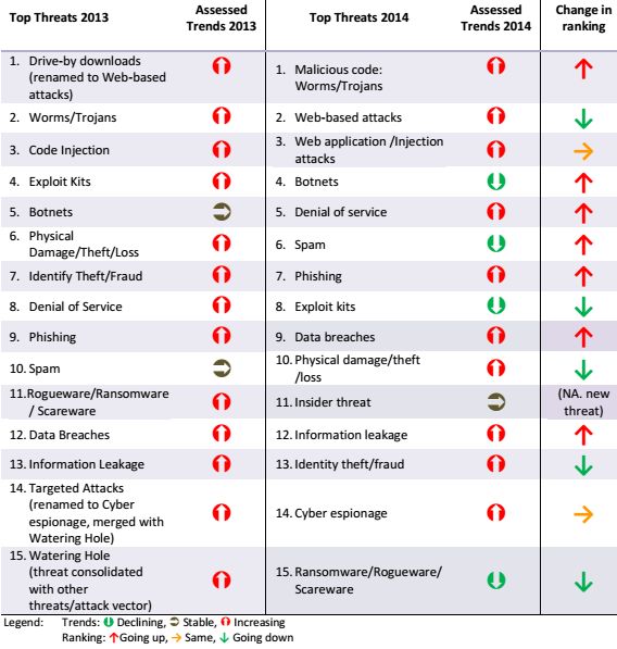 Tabelle 2 aus dem Bericht zeigt die 15 TOP-Bedrohungen und Ihre Veränderung gegenüber dem Jahr 2013.