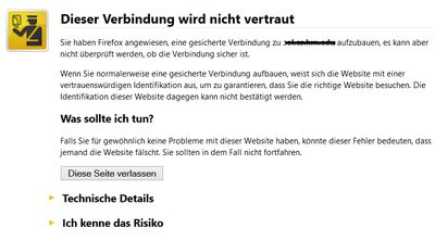 Anderfalls käme es zu einem Zertifikatsfehler, wie ihn jeder schon mal gesehen hat. Deshalb muss auf den Clienten-Rechnern das Zertifikat dieser Pseudo-CA in den Speicher für die vertrauenswürdigen Zertifizierungsstellen gebracht werden. In einem Unternehmen mit gemanagten Rechnern ist das kein Problem.